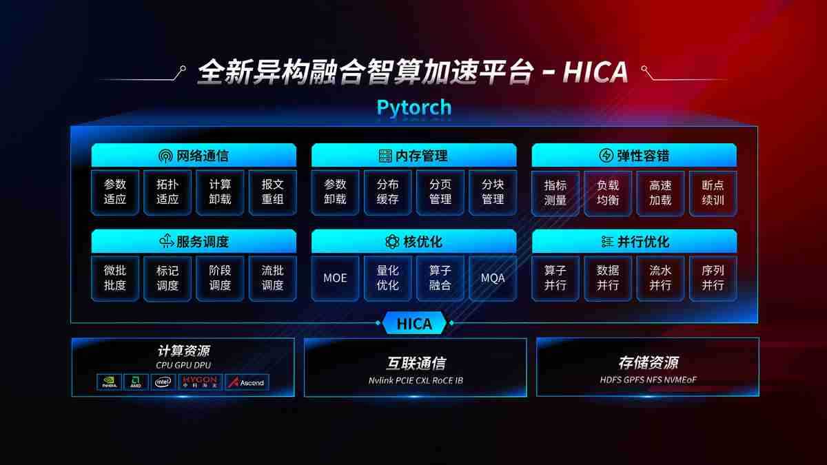通过自研的服务层、、中间适配层、、、以及调度编排算法,,,采用数据并行、、、、模型并行等多种并行方式,,,,把并行计算任务进行有效的分解,,,使其分别由相应的软件栈和算力资源来承接。。。当GPU资源变化,,,HICA可以实时动态调度计算子任务并调整模型拓扑和架构,,,以充分聚合各种算力资源。。。。