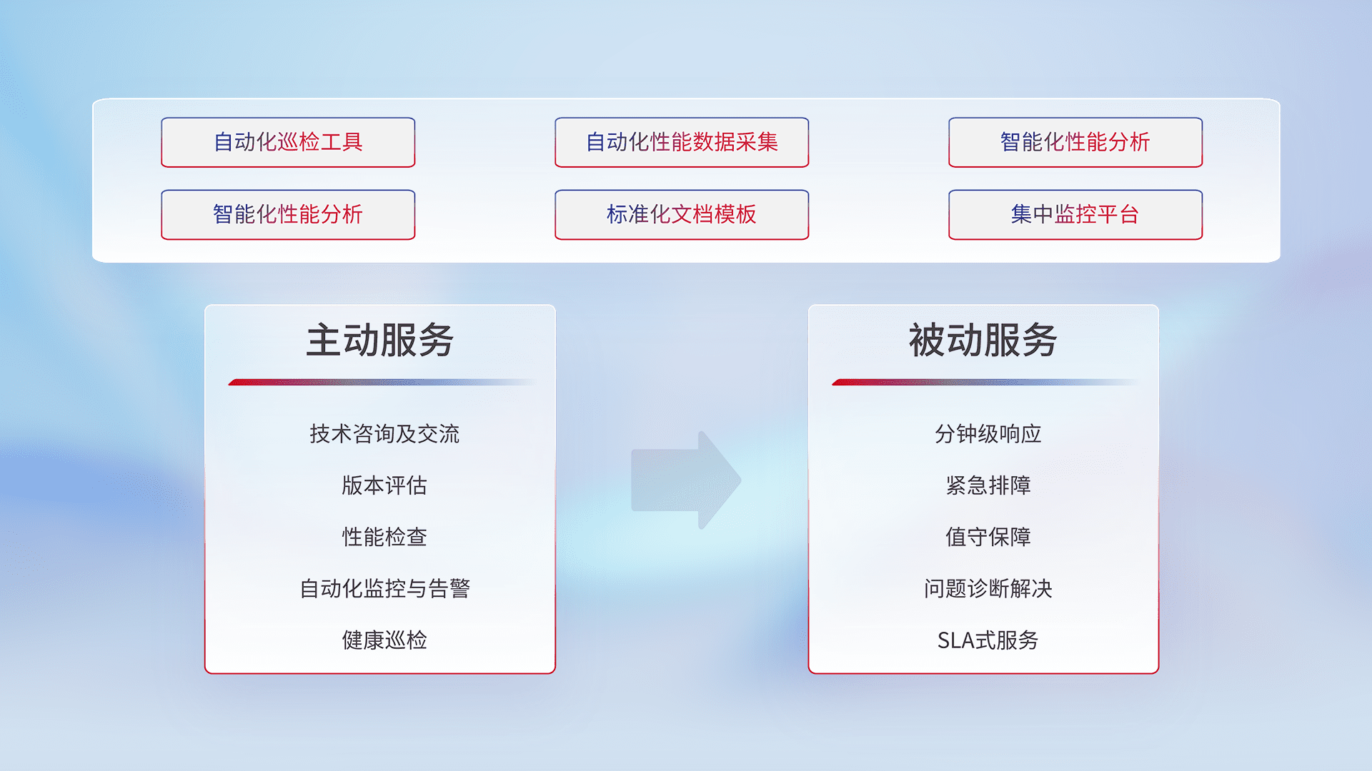 智能化工具和标准化文档,,,,保障服务质量,,,,提供主动服务(包含技术咨询、、、、版本评估、、、性能检查、、、、自动化监控与告警、、、健康巡检)和被动服务包含(分钟级响应、、、、紧急排障、、、、值守保障、、、问题诊断解决、、、、SLA服务)。。。